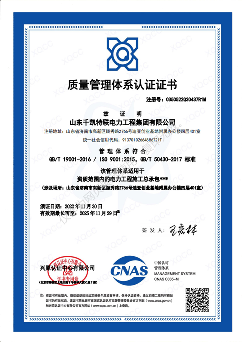 ISO9001質量管理體系證書(電力施工)