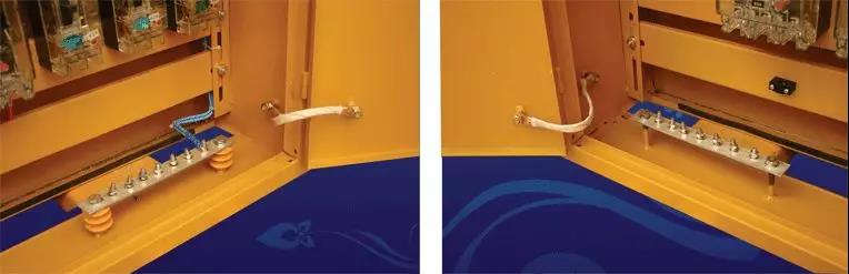 配電箱(柜)、開關箱應分設N線、PE線端子板,進出線必須通過端子板做可靠連接。N線端子板必須與金屬電器安裝板絕緣;PE線端子板必須與金屬電器安裝板做電氣連接。進出線中的N線必須通過N線端子板連接;PE線必須通過PE線端子板連接。PE線與端子板連接必須采用電氣連接,電氣連接點的數量應比箱體內回路數量多2個,1個為PE線進箱體的連接點,1個為重復接地的連接點。