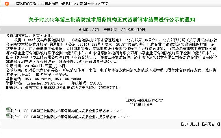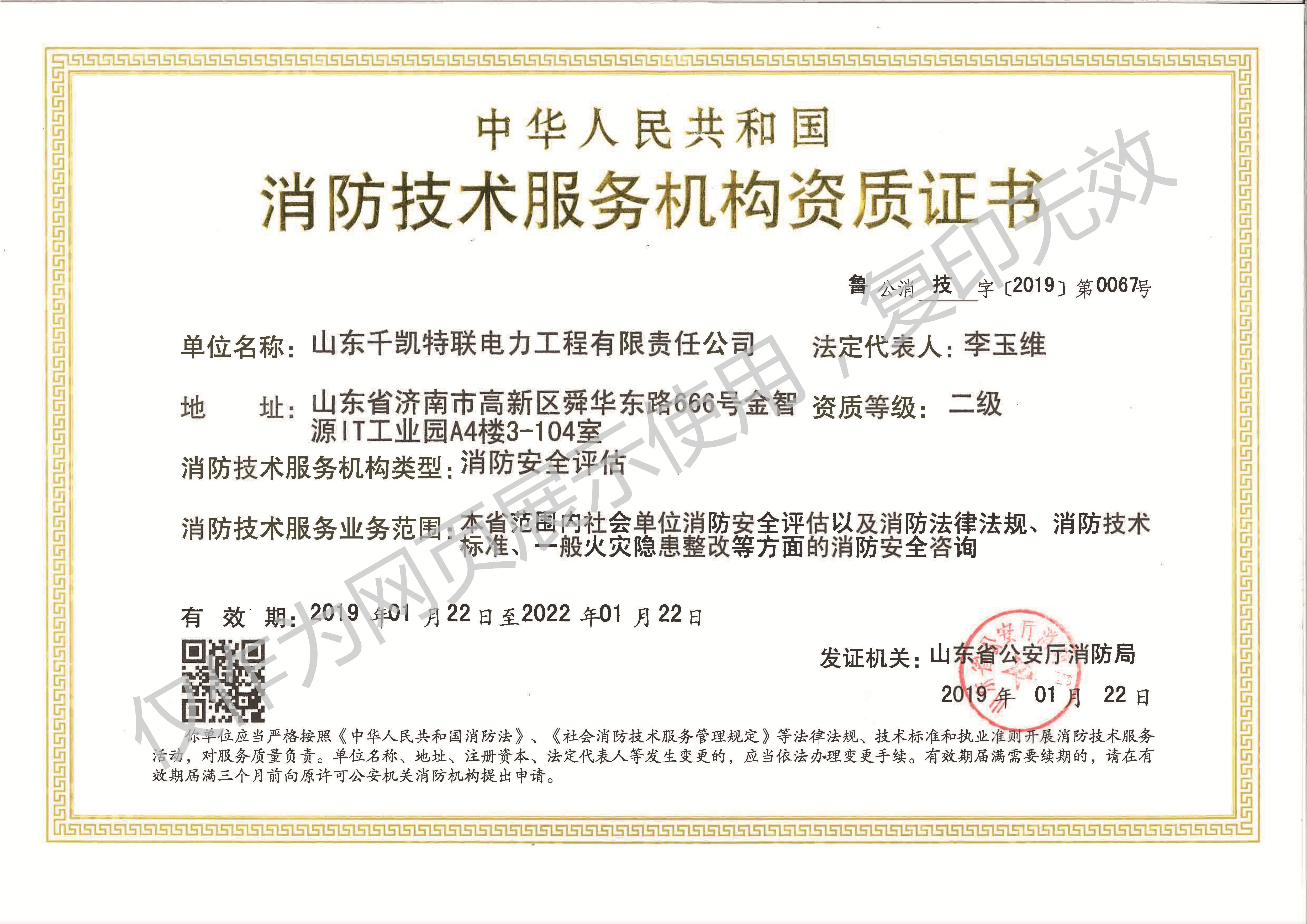 在公司領導和各部門的全力配合下,經過材料申報、嚴格的現(xiàn)場條件審查、公安部消防局材料復核等層層考核,山東千凱特聯(lián)電力工程有限責任公司于2019年1月22日順利取得了消防技術服務機構資質證書(消防安全評估二級資質)。此證書是由山東省公安廳消防局批準并頒發(fā),可承擔本省范圍內社會單位消防安全評估以及消防法律法規(guī)、消防技術標準、一般火災隱患整改等方面的消防安全咨詢。