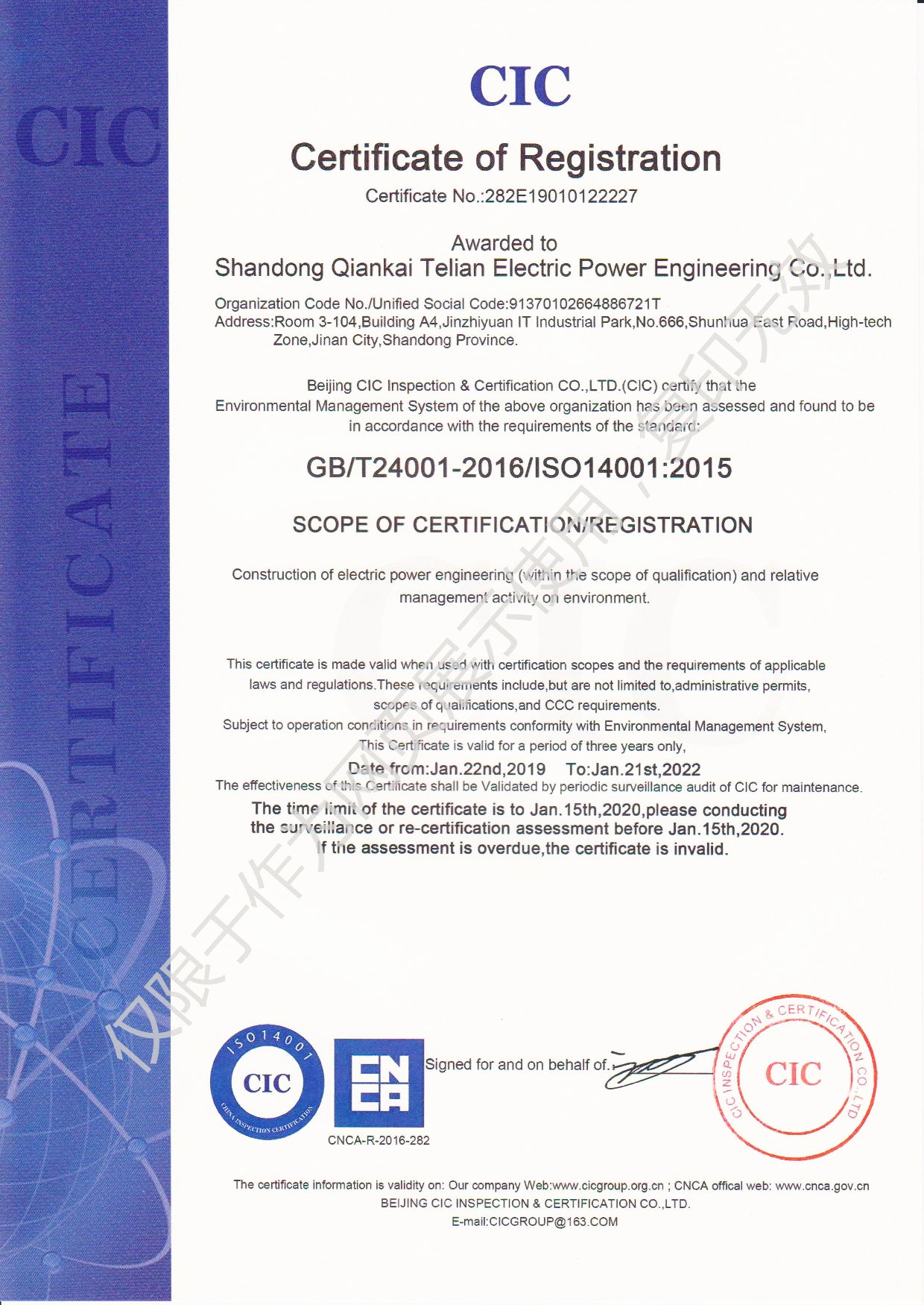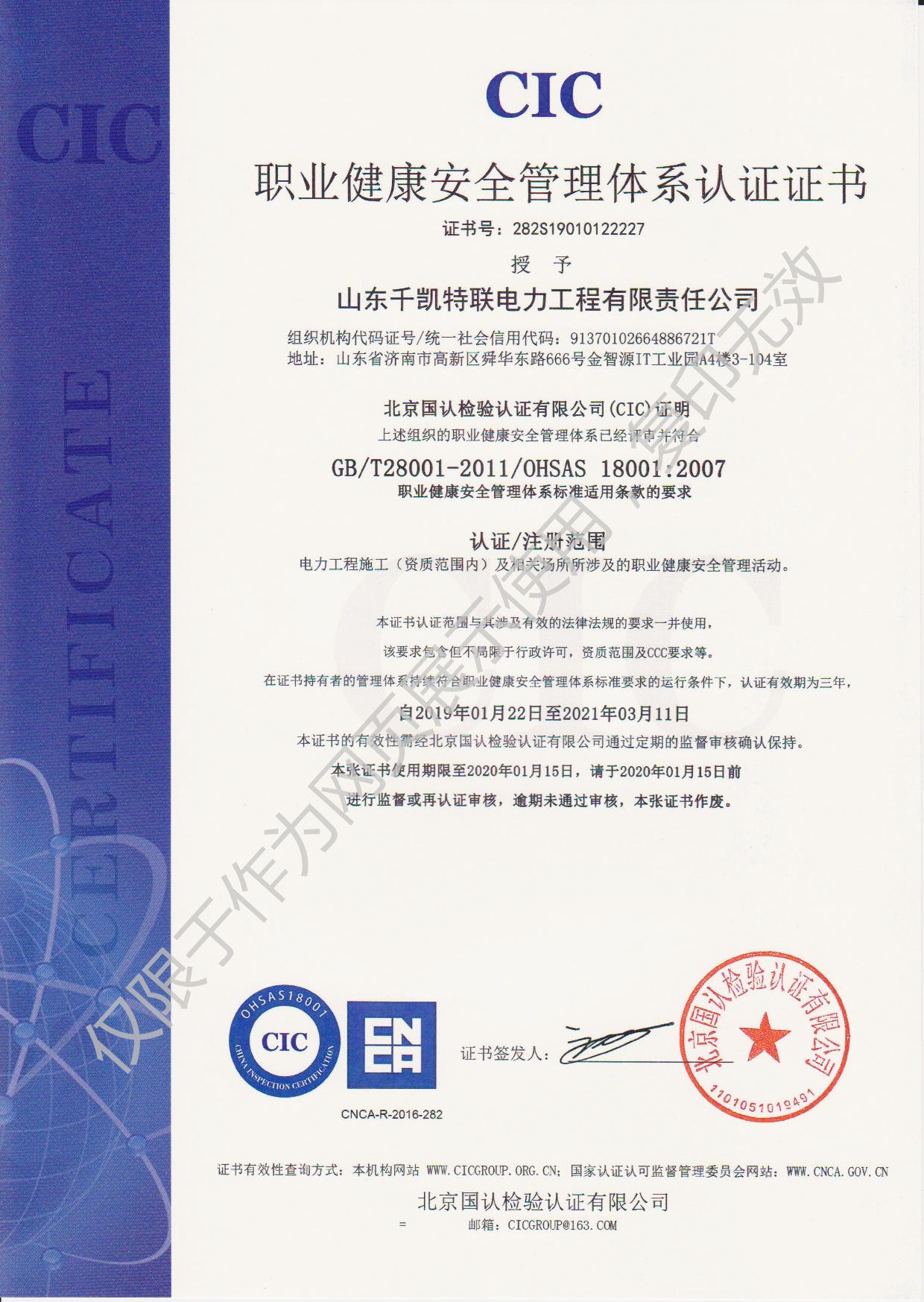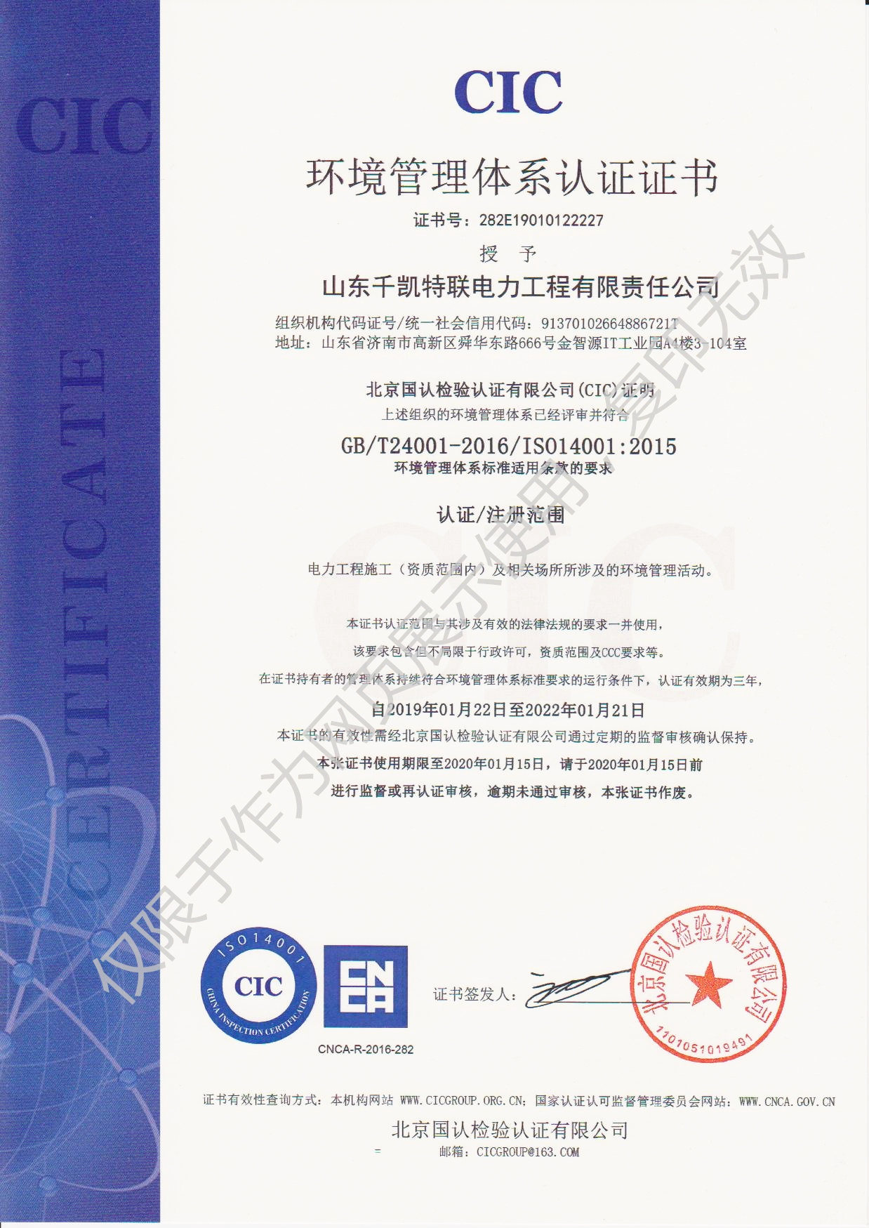 2019年1月22日,山東千凱特聯(lián)電力工程有限責(zé)任公司順利通過(guò)ISO14001環(huán)境管理體系認(rèn)證和OHSAS18001職業(yè)健康安全管理體系認(rèn)證并取得證書。加上之前取得的ISO9001質(zhì)量管理體系證書,三大體系證書的取得是公司各項(xiàng)管理工作的規(guī)范化、標(biāo)準(zhǔn)化的全面檢測(cè)。我們將進(jìn)一步優(yōu)化和規(guī)范各項(xiàng)管理制度,不斷提高體系運(yùn)行的有效性,不斷提高公司的管理水平,共同推進(jìn)公司的快速發(fā)展。